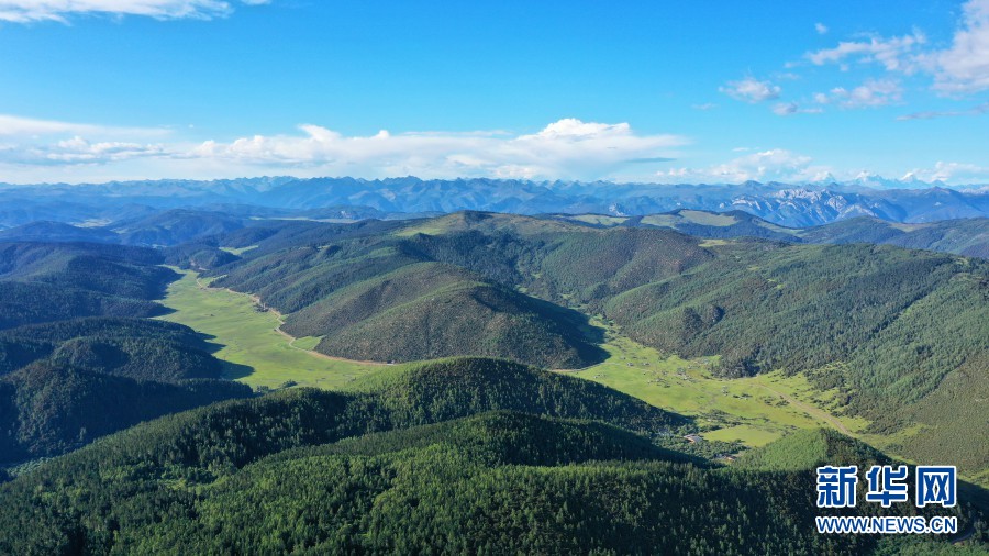 航拍視角下的普達措高山和草甸(攝于8月27日)。新華網(wǎng) 趙普凡 攝