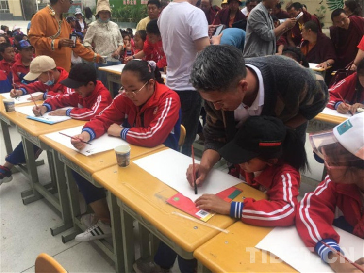 “右手拿筆,拇指和食指握住距離筆尖3厘米左右的位置,掌心中空書寫,對(duì),就是這樣。”來自四川省藏文學(xué)校、西南民族大學(xué)、康巴文化研究院、甘孜日?qǐng)?bào)社、甘孜民族中學(xué)、理塘?xí)覅f(xié)會(huì)等單位的14位書法家在縣城關(guān)小學(xué)為近100名小學(xué)生現(xiàn)場(chǎng)傳授和指導(dǎo)藏文書法書寫技巧和心得。
