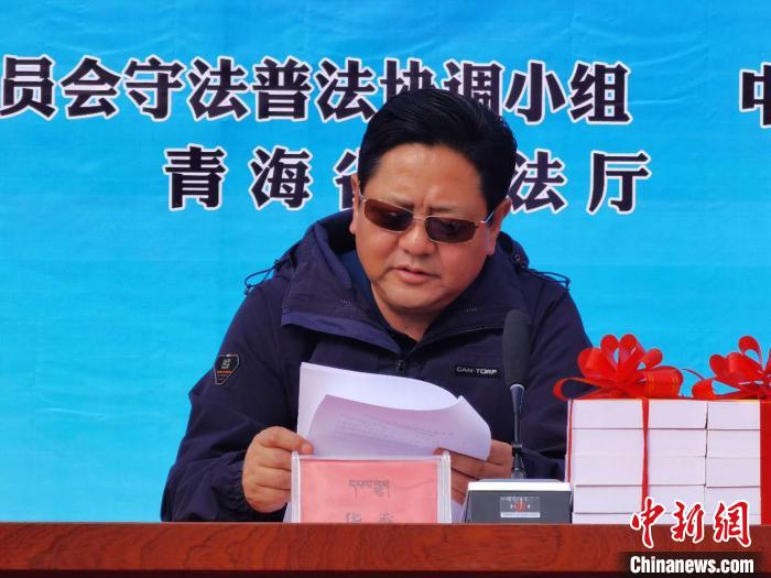 圖為青海省委統(tǒng)戰(zhàn)部副部長(zhǎng)華秀宣讀《關(guān)于成立青海省宗教活動(dòng)場(chǎng)所法治宣講團(tuán)的通知》。潘雨潔 攝