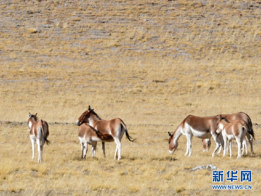 10月30日在青海省果洛藏族自治州瑪多縣境內(nèi)拍攝的一群藏野驢。新華社記者 張龍 攝
