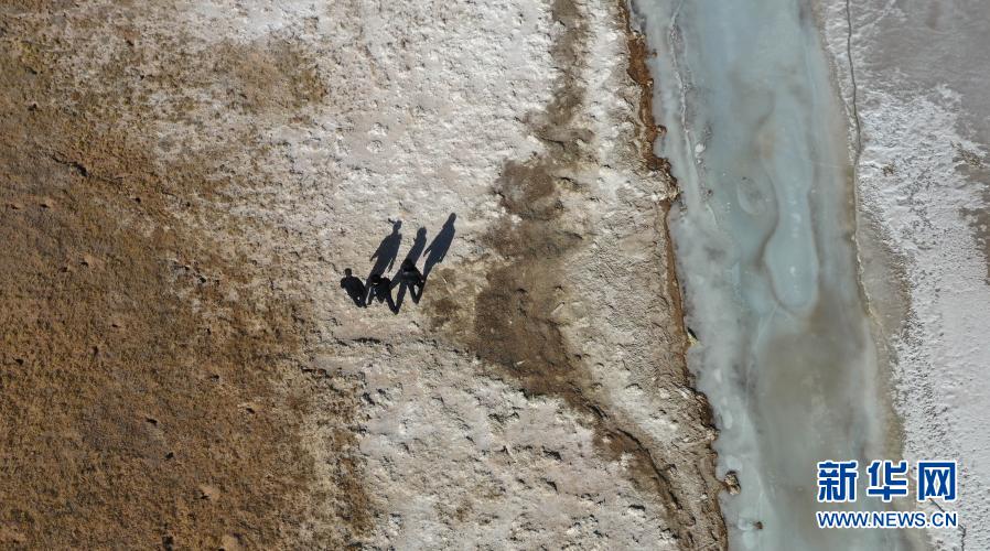 12月7日,站長(zhǎng)趙新錄(中)與隊(duì)友鄧海平(左)、達(dá)才在可可西里索南達(dá)杰保護(hù)站管護(hù)區(qū)域內(nèi)巡查(無人機(jī)照片)。新華社記者 王艷 攝
