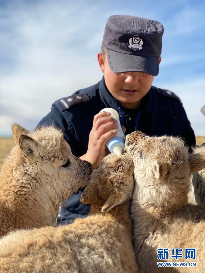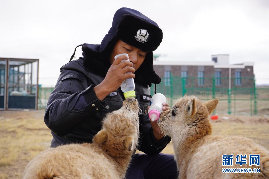 12月7日,可可西里巡山隊(duì)員達(dá)才在給藏羚羊幼仔喂奶。新華社記者 藍(lán)翔 攝
