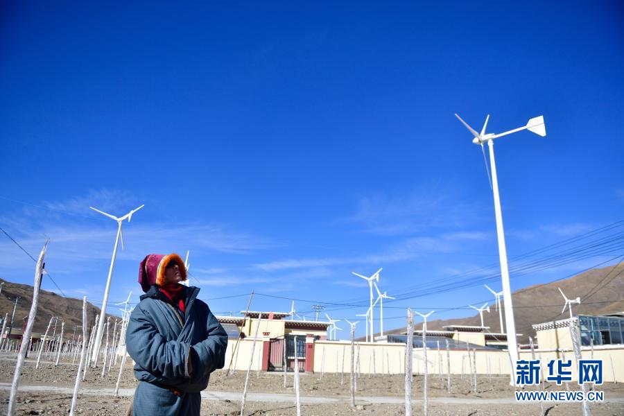1月11日,隆亞村村支部書記貢保多杰在查看搬遷點的風(fēng)力發(fā)電機(jī)組運(yùn)行情況。新華社記者 張龍 攝