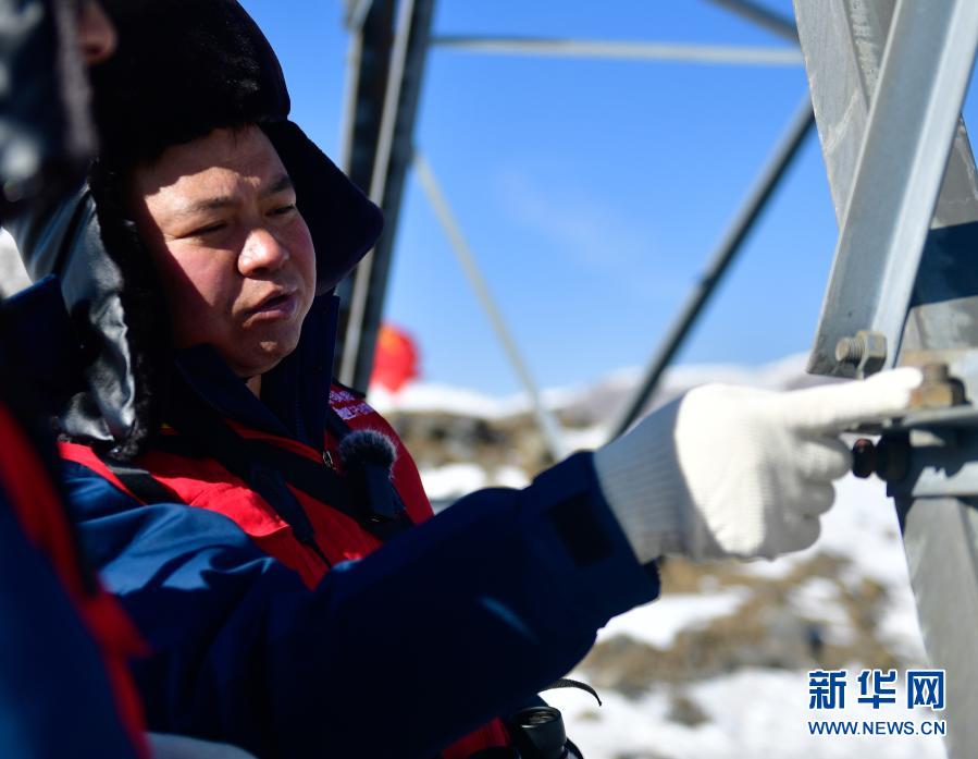 1月21日,國(guó)家電網(wǎng)西寧供電公司輸電運(yùn)檢中心運(yùn)檢人員董進(jìn)軍在測(cè)量線路耐張線夾溫度。新華社記者 張龍 攝