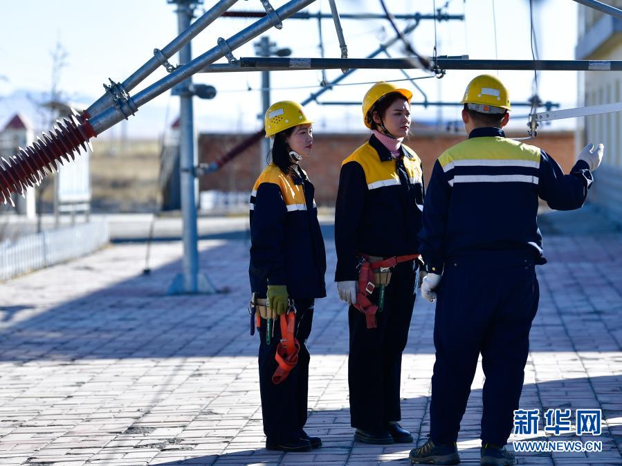 2月2日,在青藏鐵路公司西寧供電段哈爾蓋工區(qū),郭勝?gòu)?qiáng)(左)與羅露露(中)在聽老職工講解安全知識(shí)?!⌒氯A社記者 張龍 攝