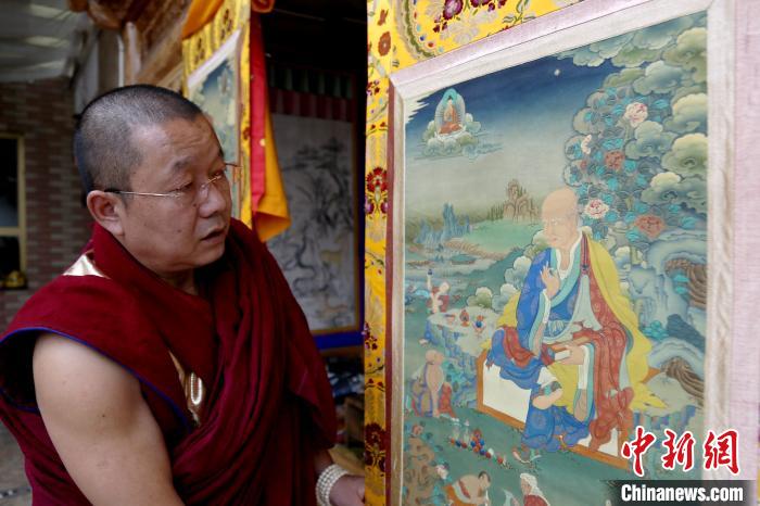 圖為印巴尖措展示唐卡作品。張?zhí)砀?攝