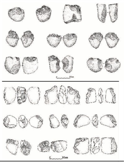 石核—石片工業(yè)生產(chǎn)的鋒利石片往往可以直接被早期人類使用,有的被進(jìn)一步修理為刮削器和尖狀器等,在屠宰肢解動物、切割肉食和刮削竹木等經(jīng)濟(jì)活動中發(fā)揮重要作用。石核往往是生產(chǎn)這些石片的副產(chǎn)品,從而被廢棄,有時石核會被石器生產(chǎn)者進(jìn)一步加工為工具,如作為砍砸器使用。