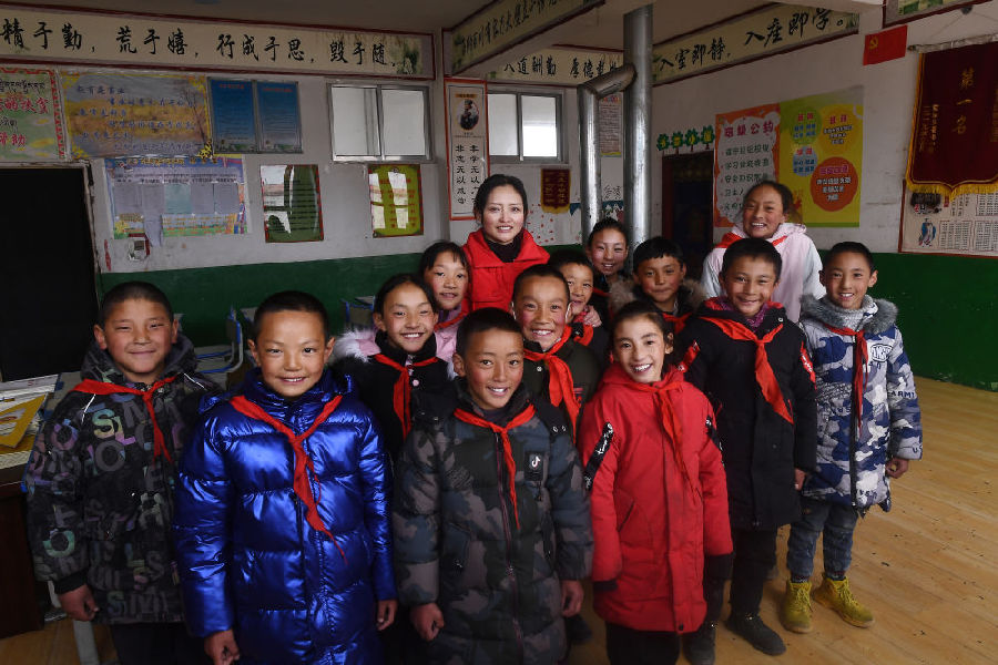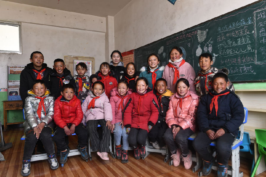 3月16日,在索加鄉(xiāng)寄宿小學,查日老師(后排中)和學生在一起。新華社記者 駱曉飛 攝