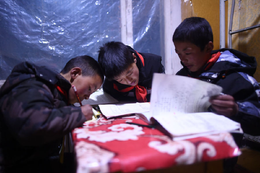 3月16日,在索加鄉(xiāng)寄宿小學,羅松東?。ㄖ校┖托』锇樵谒奚醿?nèi)溫習功課。新華社記者 張宏祥 攝