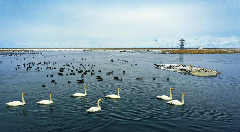 3月6日,若爾蓋濕地國家級自然保護(hù)區(qū)在花湖設(shè)立的高科技無人觀測塔(右后)正全天候觀察濕地鳥類的活動(dòng)。尹鋼 攝