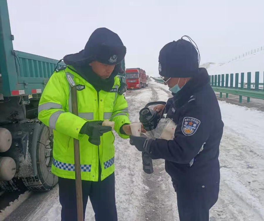 李西和同事們紛紛拿起鐵鍬將積雪鏟至道路兩邊,迅速開(kāi)辟出一條臨時(shí)車道,讓車輛緩慢通行,這時(shí)他們已經(jīng)連續(xù)奮戰(zhàn)7個(gè)多小時(shí)。民警吃的是溫水泡的方便面,渴了就喝冰涼的礦泉水,或者直接抓一把雪塞到嘴里。累的實(shí)在不行就隨便找個(gè)能擋風(fēng)的地方睡一會(huì)。有時(shí)候遇到堵車,有些司乘人員沒(méi)有帶食物,大家還把自己的口糧分給他們,他們只能挨著餓。