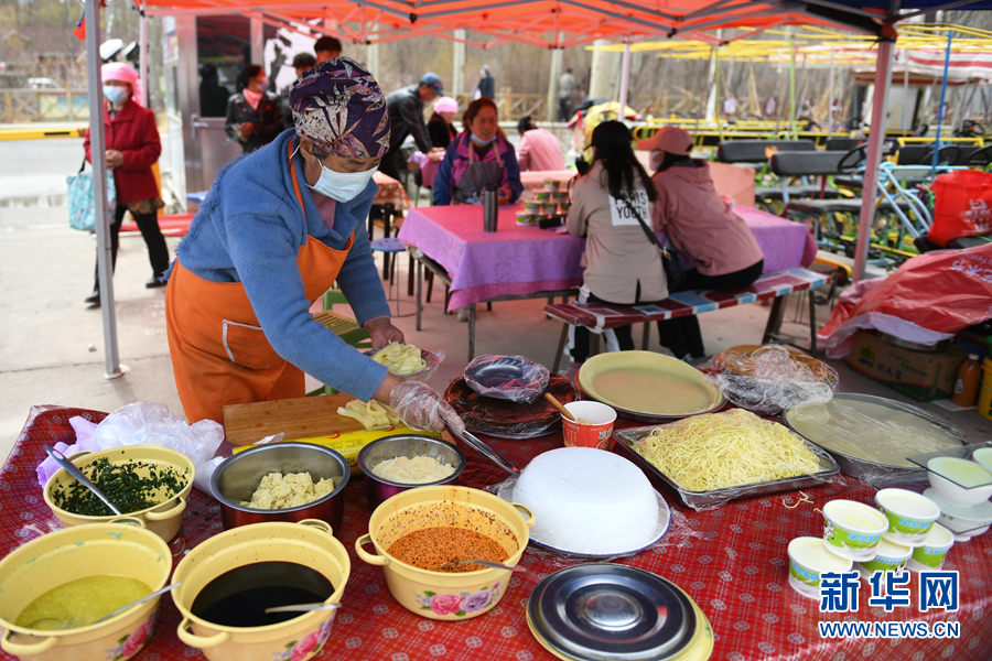 這兩天的貴德縣格外熱鬧,一簇簇雪白的梨花競(jìng)相綻放,引得許多“踏春人”來這里“打卡”。在貴德縣水車廣場(chǎng)旁邊的小吃攤上,許元梅把一碗調(diào)好的釀皮端給顧客,忙完之后,她又給下一位顧客打包好一份酸奶。最近,貴德縣的游客漸漸多了起來,休息了一個(gè)冬天后,許元梅又支起了自己的小吃攤,為過往游客制作美食。
