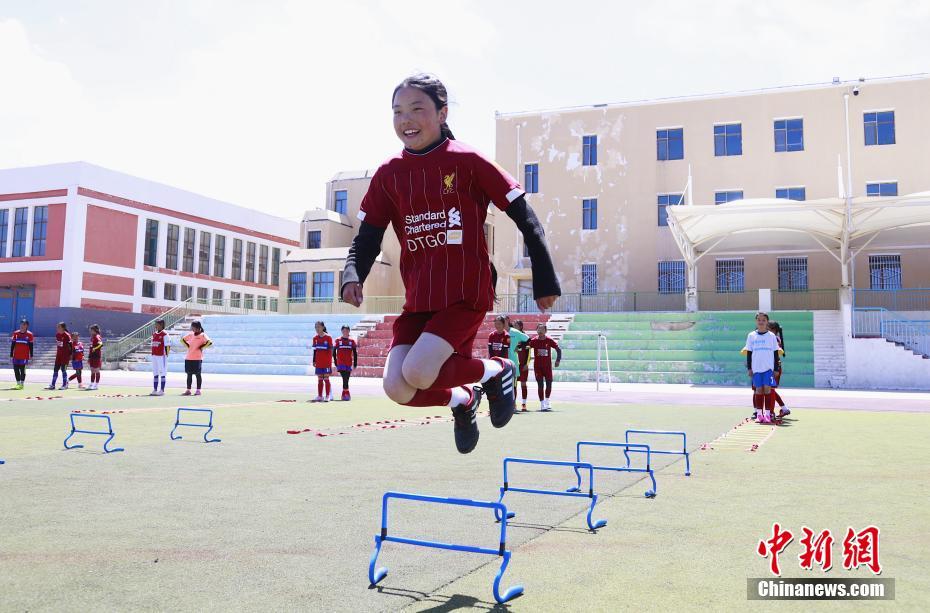 4月21日,青海省海南藏族自治州共和縣,青海湖民族寄宿制學校的足球場上,女子足球隊的隊員們正在進行訓練。該校的女子足球隊共有小學組、初中組隊員53人,皆為來自牧區(qū)的藏族女孩。中新社記者 馬銘言 攝