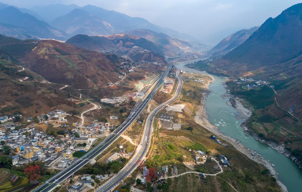 保瀘高速、美麗公路南延線與怒江(從左到右)。新華社記者 陳欣波 攝