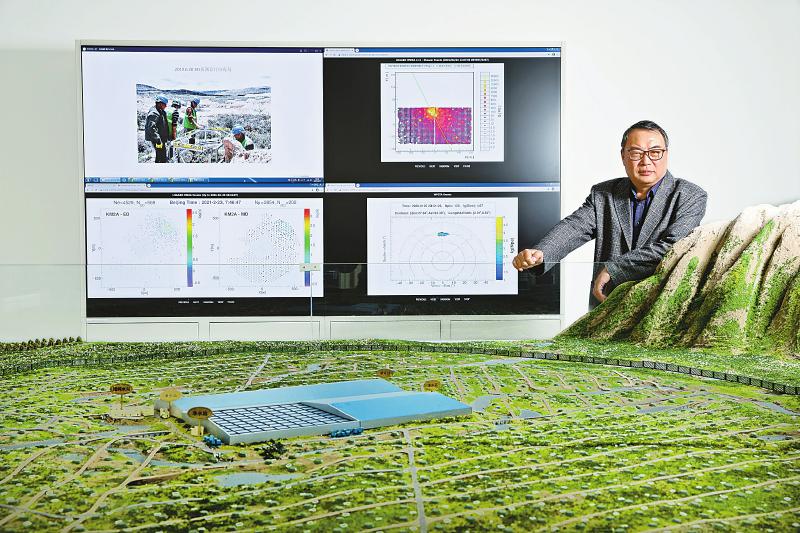 曹臻在高海拔宇宙線觀測(cè)站沙盤前留影(2021年2月23日攝)。新華社記者 金立旺 攝