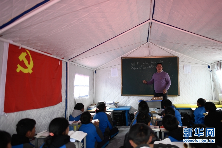 灰白色的天幕下,湛藍(lán)色的救災(zāi)帳篷顯得格外顯眼。學(xué)校教師拉毛措告訴記者:地震發(fā)生后,老師們組織186名學(xué)生在5分鐘內(nèi)全部疏散到操場,隨后轉(zhuǎn)移到搭建好的救災(zāi)帳篷內(nèi)。