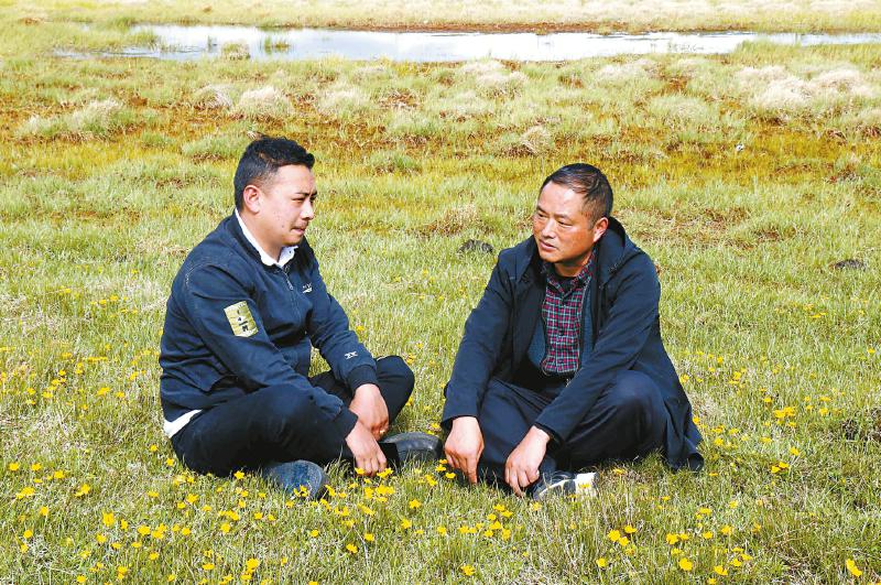若爾蓋縣科學(xué)技術(shù)和農(nóng)業(yè)畜牧局局長張建榮(右)與牧民交流。四川日報(bào)全媒體記者 徐登林 攝