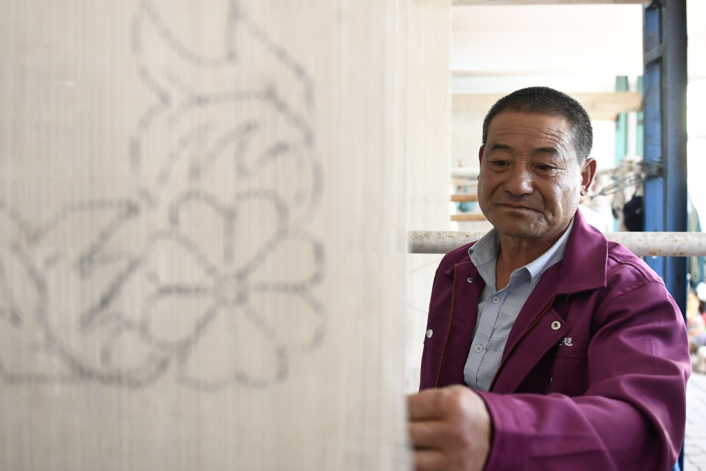 在青海省西寧市湟中區(qū)上新莊鎮(zhèn)加牙村,藏毯手工藝人楊永良坐在一臺(tái)織機(jī)前,五顏六色的毛線穿梭在編織桿間,重疊打扣后,慢慢延展成花色精美的藏毯。