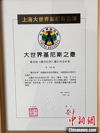 6月10日,青海省玉樹州治多縣唐蕃古道文化博物館發(fā)布信息稱,由該管收藏的國家級非物質(zhì)文化遺產(chǎn)——藏族民間文學手抄《康巴拉伊》最長藏文書法長卷,獲評“大世界基尼斯之最”(中國之最)。