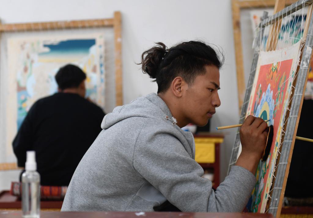 6月17日,在青海民族大學(xué)藝術(shù)學(xué)院,工藝美術(shù)(唐卡)專業(yè)學(xué)生在繪制唐卡。新華社記者 張龍 攝