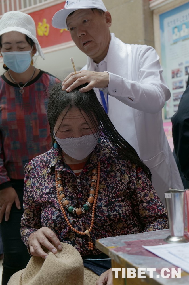一位就診的女患者右腿小腿部滿凹凸不平,趙臣來在她的小腿上、頭部后側(cè)扎了針,并讓她走幾步看看,“這是骨關(guān)節(jié)炎,您平時(shí)注意不要受風(fēng)著涼,坐的時(shí)間別太長,可以坐得稍高一點(diǎn),也不要深蹲……我再給您開些藥吧?!辈灰粫?huì)兒,這位女士說稍有緩解,不禁連連稱謝:“瓜珍切”(藏語“謝謝”)。這真是太神了!