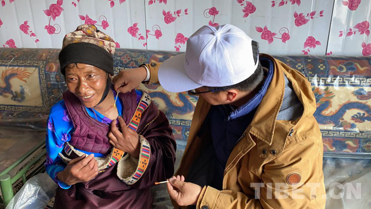 49歲的拉毛羊措則是甲狀腺手術康復不久,她愛人已經(jīng)去世,和一兒一女及小外孫女一起生活,而女兒也患有肺結核。看到送來的藥物與生活用品,拉毛羊措一直用藏語說著“謝謝”,并豎起大拇指,臉上始終帶著發(fā)自內(nèi)心的淳樸笑容。