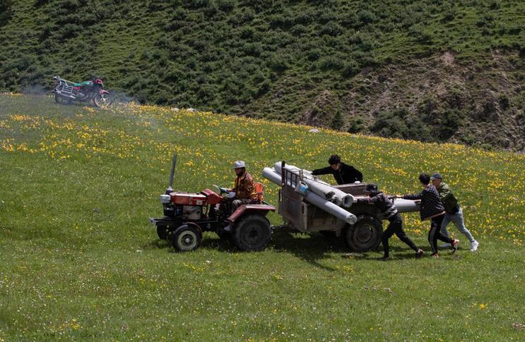 7月25日,在道孚縣龍燈草原,牧民在運(yùn)輸水泥電線桿。新華社記者 劉夢琪 攝