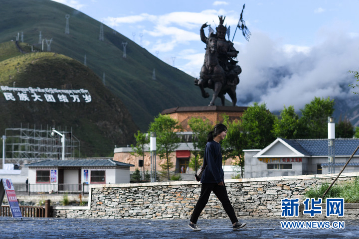 8月6日,市民走過玉樹市格薩爾廣場。新華社記者 吳剛 攝