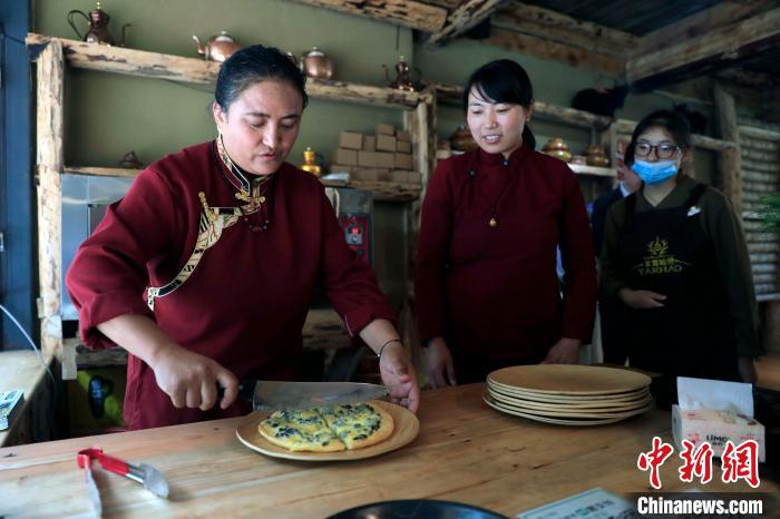 羊茸村村民為游客準(zhǔn)備由本地食材制成的“藏式披薩”。王磊 攝