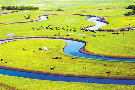 黃河首曲,綠毯似的草地延伸向遠方,黃河支流似飄帶般蜿蜒其間……