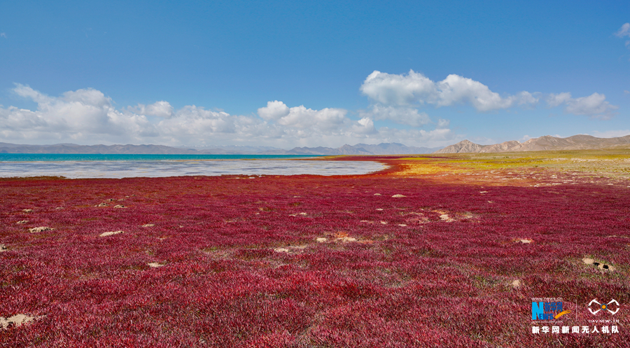 冬格措納湖位于青海省果洛藏族自治州瑪多縣境內,海拔4000米以上。秋日的冬格措納湖,湖水湛藍、天空遼闊,湖畔的草地紅綠黃交融,一幅大自然的美麗畫卷在這里展開。新華網 宋忠勇 攝
