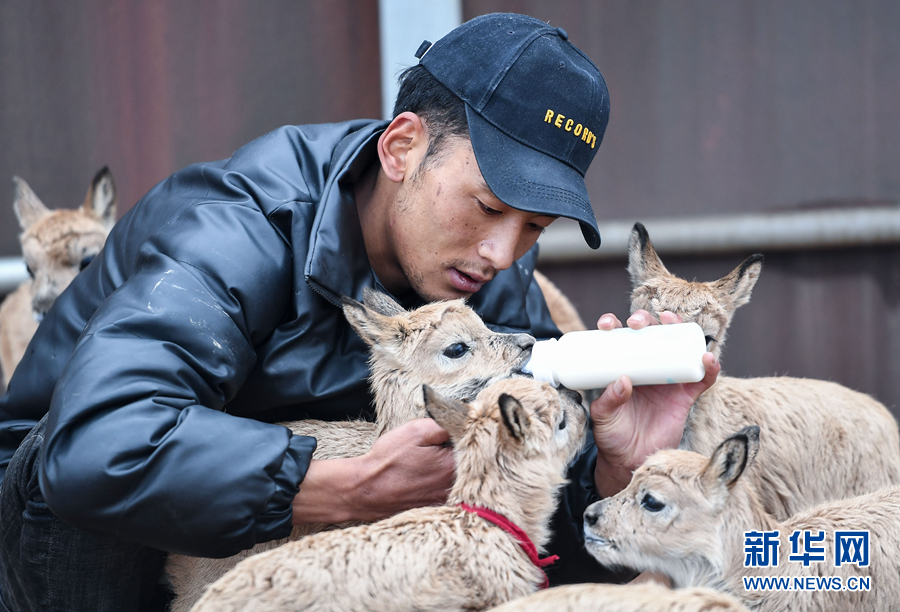 可可西里國(guó)家級(jí)自然保護(hù)區(qū)卓乃湖保護(hù)站的工作人員才文多杰在給藏羚羊幼仔喂奶(2020年7月7日攝)。新華社記者 薛玉斌 攝