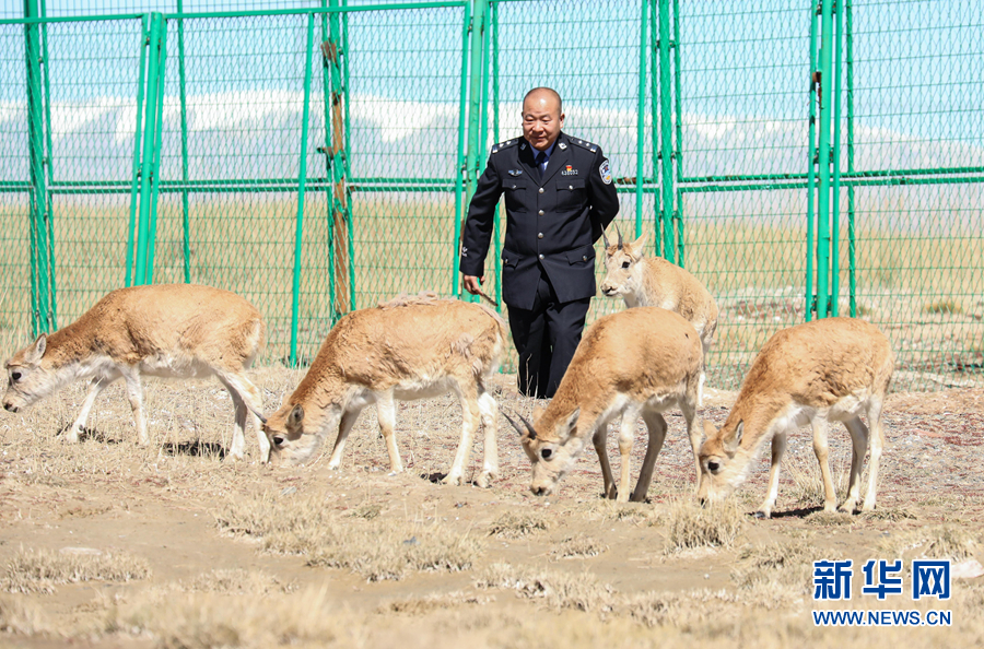 在可可西里國(guó)家級(jí)自然保護(hù)區(qū)索南達(dá)杰保護(hù)站,站長(zhǎng)趙新錄與藏羚羊在一起(9月28日攝)。新華社記者 李占軼 攝