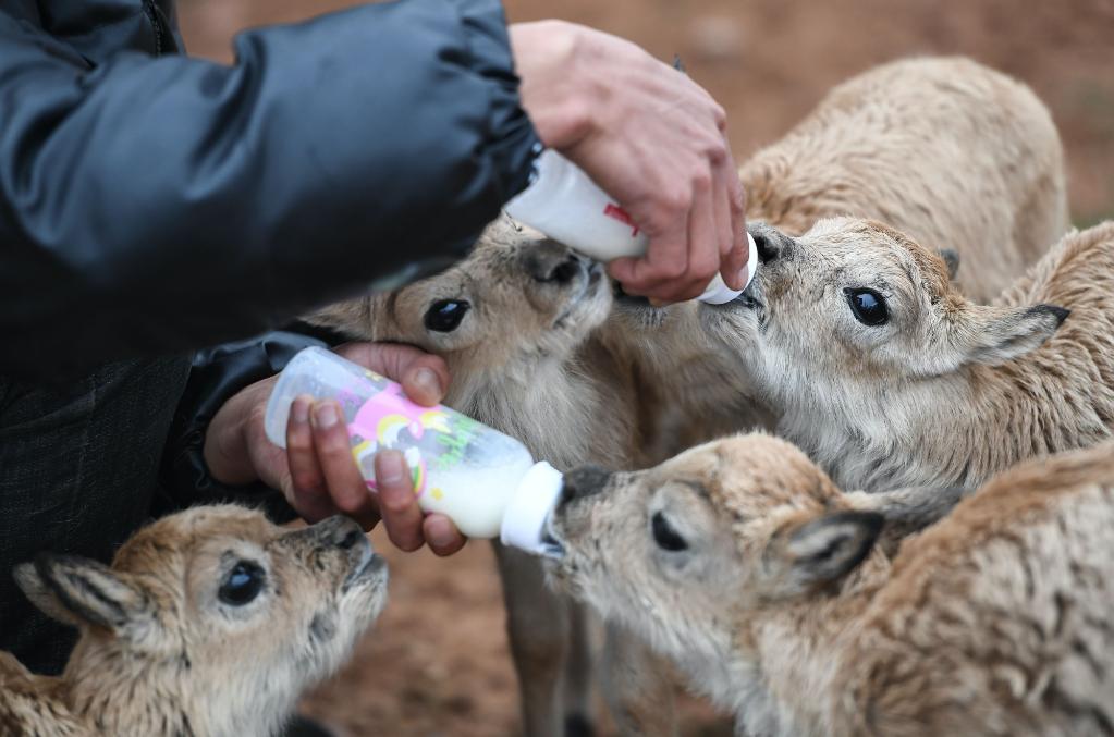 2020年7月7日,三江源國家公園管理局長江源園區(qū)可可西里管理處卓乃湖保護(hù)站的工作人員在給藏羚羊幼仔喂奶。新華社記者 薛玉斌 攝