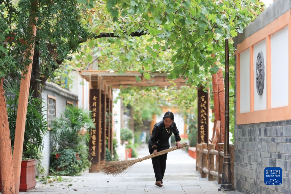 10月13日,服務(wù)員在舟曲縣巴藏鎮(zhèn)前北山村各皂壩生態(tài)園的民宿里整理床鋪。新華社記者 馬希平 攝