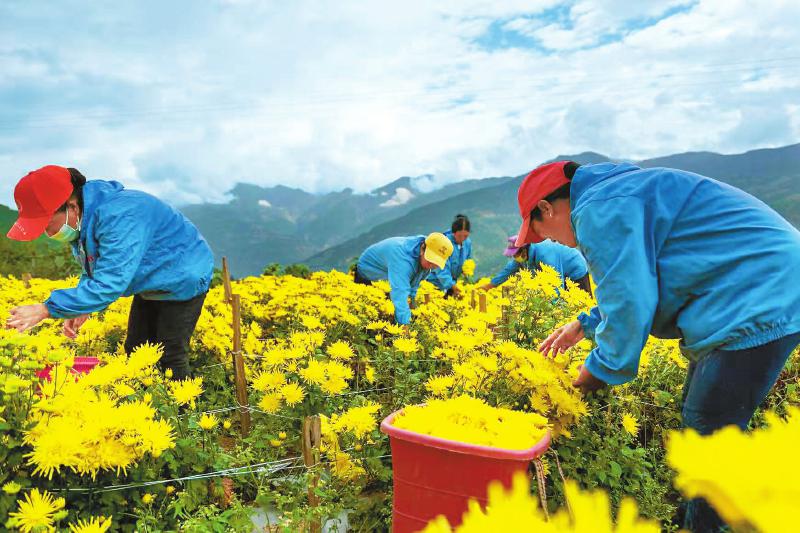 位于涼山州木里縣喬瓦鎮(zhèn)簸箕籮村的農(nóng)業(yè)產(chǎn)業(yè)示范園里,村民正忙著采摘金絲皇菊。李正國(guó)攝