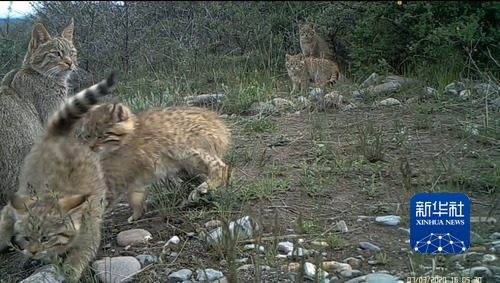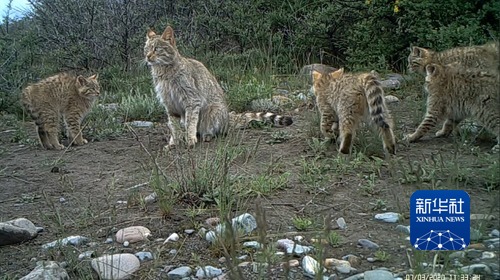 這是布設在祁連山國家公園青海片區(qū)的紅外相機拍攝到的5只荒漠貓同框畫面(2020年7月3日攝)。新華社發(fā)(祁連山國家公園青海省管理局供圖)