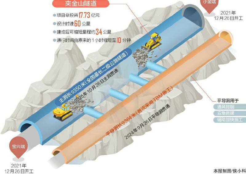 夾金山隧道全長9.35公里,建設工期4年,設計時速60公里,進出口在海拔3000米左右,比現(xiàn)在的埡口路段降低1000米,可常年全天候通行,解決了夾金山越嶺路段冬季長期管制通行的問題。隧道建成后,將節(jié)約翻越夾金山里程34公里,通行時間將由現(xiàn)在的最快1小時縮短為10分鐘。