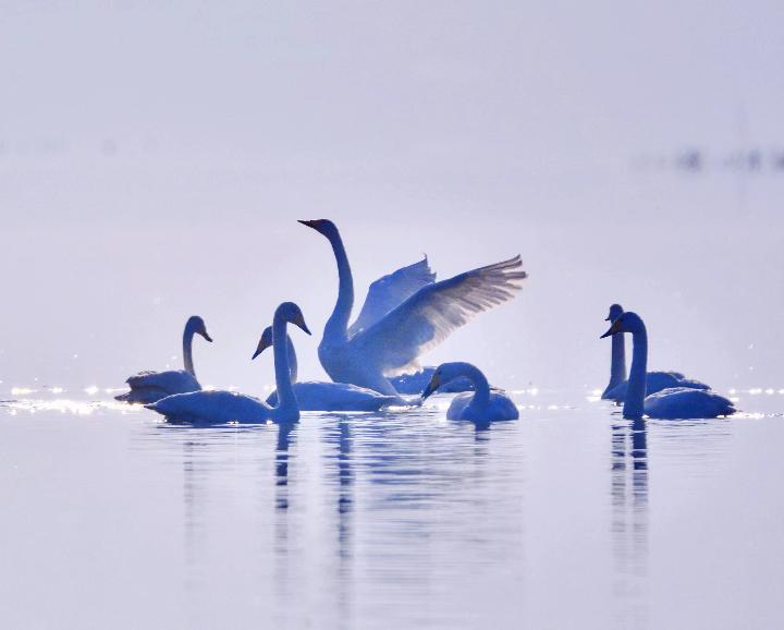 這是2021年11月23日在青海省海東市化隆回族自治縣境內的黃河濕地拍攝的大天鵝。李玉峰供圖