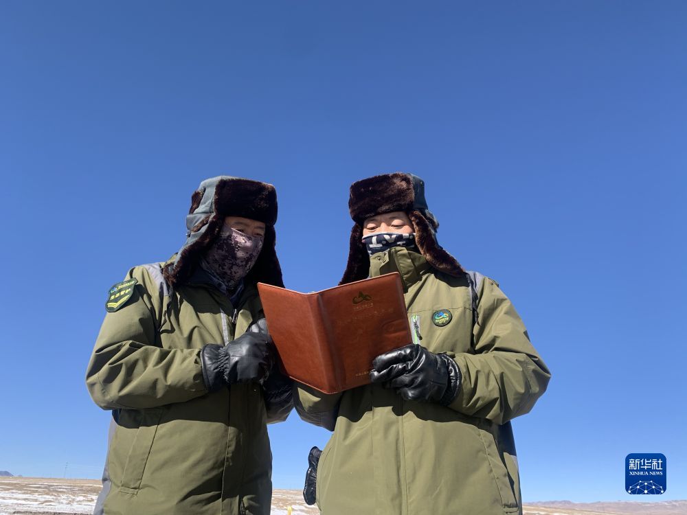 2021年12月3日,祁連山國(guó)家公園沙龍灘管護(hù)站巡護(hù)隊(duì)隊(duì)長(zhǎng)楊有財(cái)(左)在巡護(hù)監(jiān)測(cè)記錄手冊(cè)上記錄。新華社 李琳海 攝