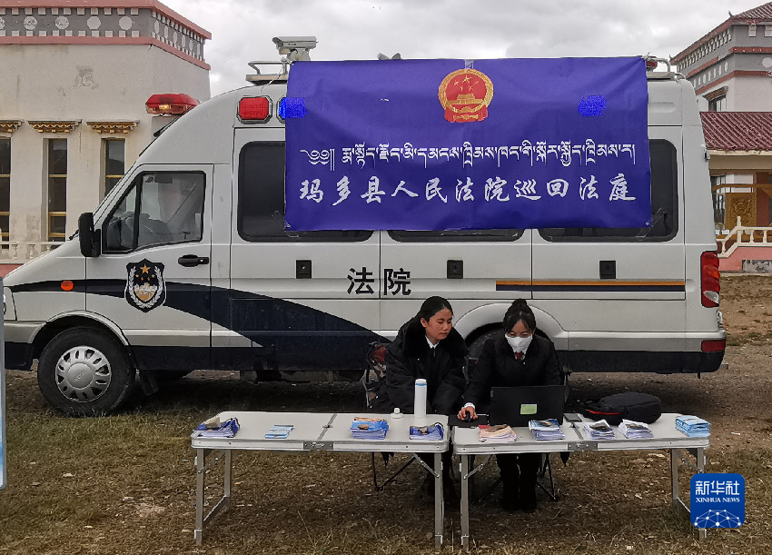 瑪多縣人民法院巡回法庭在瑪多縣扎陵湖鄉(xiāng)尕澤村開展工作(2021年8月10日攝)。新華社發(fā)