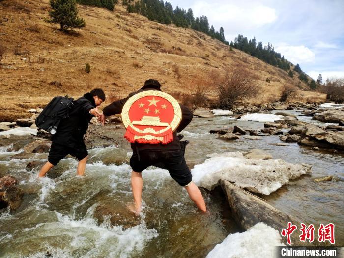 高原上,此時冰雪還未消融。陽光下行走在高山、鄉(xiāng)村小路上,法官背上莊嚴的國徽顯得格外熠熠生輝。
