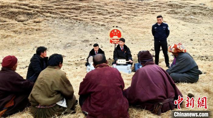 草地上阿察鎮(zhèn)巡回法庭運用便攜式科技開展庭審工作。 白玉縣人民法院供圖