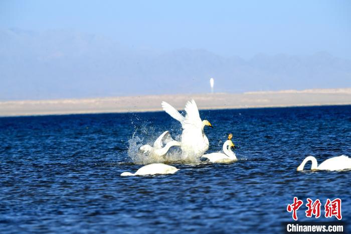 圖為天鵝群在湖中游蕩。青海多美生態(tài)環(huán)保科技有限公司 供圖