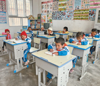 2017年,隨著易地扶貧搬遷政策的落實(shí),越來越多村民選擇搬到山腳開始新的生活。學(xué)校里的孩子們由32名減少到9名?!?個(gè)孩子有7個(gè)是留守兒童,最大的8歲,最小的3歲?!蓖昝慈试霭押诎宸殖蓛蓧K,左邊是一年級(jí),右邊是學(xué)前班,“安排了語文、數(shù)學(xué)、美術(shù)、道德與法治4門課,采用復(fù)式班的教學(xué)模式”。