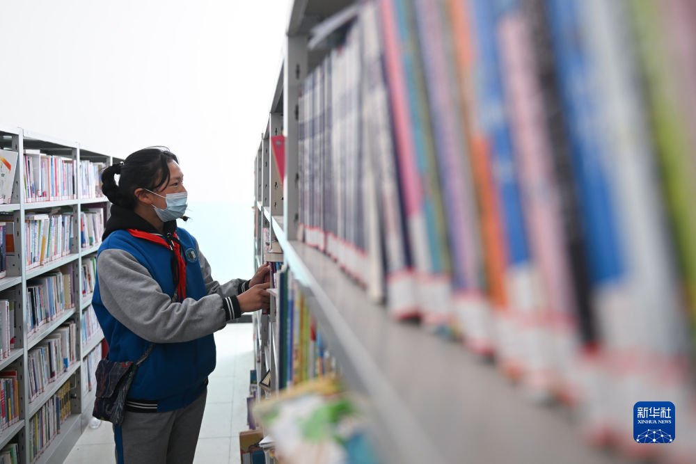 4月22日,青海省玉樹(shù)藏族自治州曲麻萊縣巴干鄉(xiāng)寄宿制小學(xué)的學(xué)生在圖書(shū)室借閱圖書(shū)。新華社記者 張龍 攝