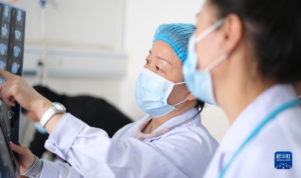 4月25日,青海省人民醫(yī)院醫(yī)生、青南支醫(yī)隊(duì)員謝延玲(右二)和青海省玉樹(shù)藏族自治州人民醫(yī)院醫(yī)生探討患者病情。新華社記者 央秀達(dá)珍 攝
