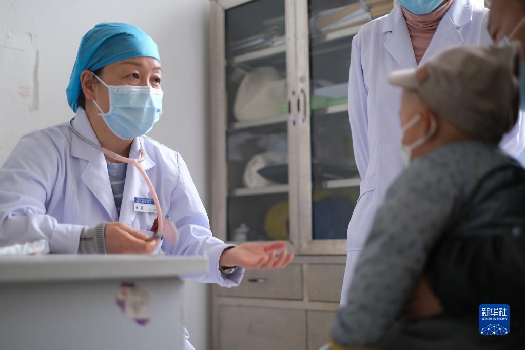 4月25日,青海省婦女兒童醫(yī)院醫(yī)生、青南支醫(yī)隊(duì)員孫敬(左一)在青海省玉樹(shù)藏族自治州人民醫(yī)院兒科門診坐診。新華社記者 韓方方 攝