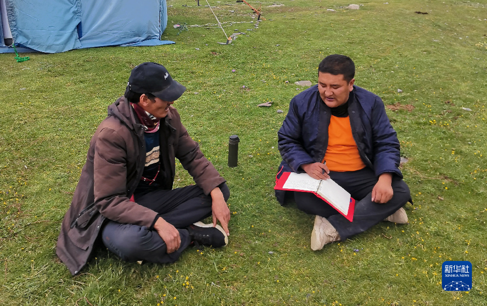 才丁加(右)正和牧民商量合作社整合草山的事宜。(受訪(fǎng)者供圖)