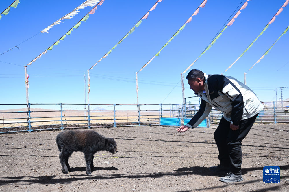 尼瑪才仁和小牛犢在一起(4月20日攝)。新華社記者 張龍 攝